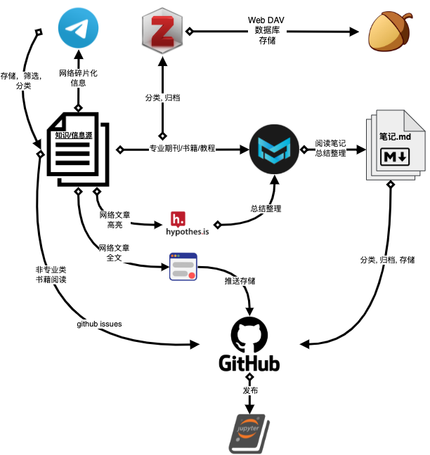 多年来对学习体系的尝试和改进一直都在持续进行着。伴随各种工具软件的迭代升级和新工具的出现,体系内的工具库和信息的摄入方法也会作出相应的更新和调整。目前个人学习体系大致可以用下图展示: